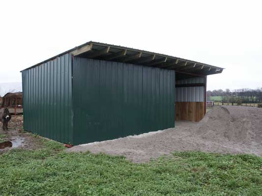 Below are photos of the third turn out shed we have ordered from Klene Pipe. This is the last pasture to add a large turn out shed too as it use to have two of the calf huts you see in some of the photos the calf hut will be removed when this shed is completed and it will be moved to the pasture with the smallest turn out shed This project was begun on November 8th, 2004This is the